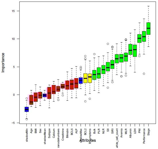 Boruta algorithm feature selection. Each bar represents a variable’s importance score relative to shadow features. Green bars indicate confirmed important variables; yellow indicates tentative; and red indicates rejected variables.
