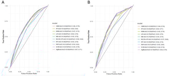 Area under the curve (AUC) for machine learning algorithms and existing prognostic tools: (A) training data set, (B) Validation set. IPI; International Prognostic Index, R-IPI; Revised-IPI, NCCN-IPI; National Comprehensive Cancer Network-IPI, LR; logistic regression, RF; random forest, XgBoost; extreme gradient boosting, KNN; K-nearest neighbour, GBM; gradient boosting, SVM; support vector machine, NB; Naïve Baye.