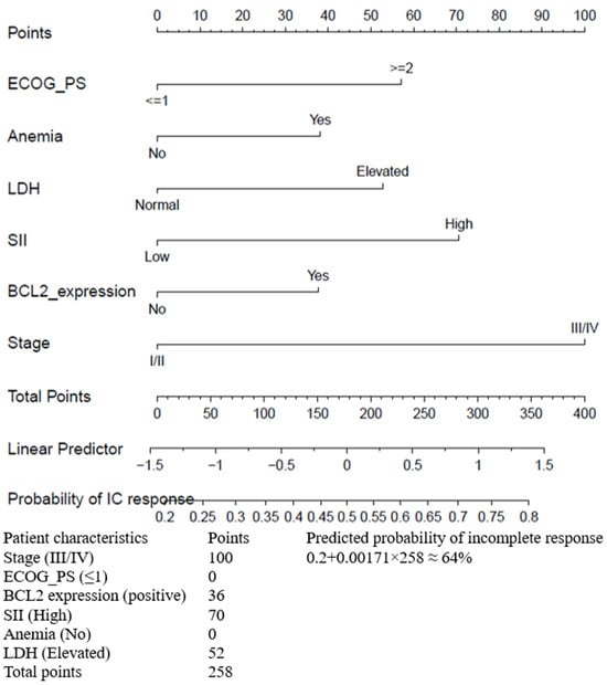 Nomogram with personalized working example for predicting incomplete (IC) treatment response in B-cell lymphomas. ECOG_PS, Eastern Cooperative Oncology Group Performance Status, stage; LDH; Lactate Dehydrogenase; SII, Systemic Immune-Inflammation Index.