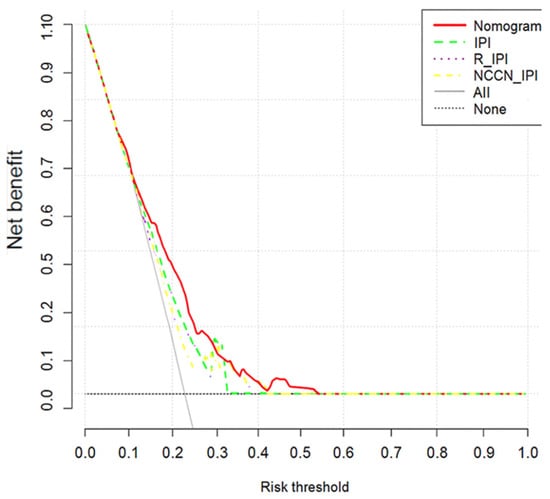 Decision curve analysis of nomogram and existing prognostic tools. IPI; International Prognostic Index, R-IPI; Revised-IPI, NCCN-IPI; National Comprehensive Cancer Network-IPI.