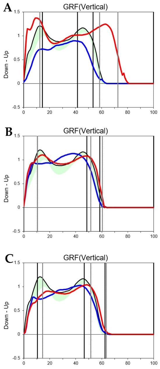 vGRF curves of a patient showing in Figure 1. The red line indicates the unaffected limb, and the blue line indicates the affected limb. The preoperative vGRF curve (A) shows a decrease in the Fz1 (1st peak) and Fz2 (2nd peak) values of the affected limb compared with the unaffected limb. The vGRF curves at one year (B) and five years (C) after surgery show that the curves of the affected and unaffected limbs were similar due to an increase in the Fz1 and Fz2 values of the affected limb.