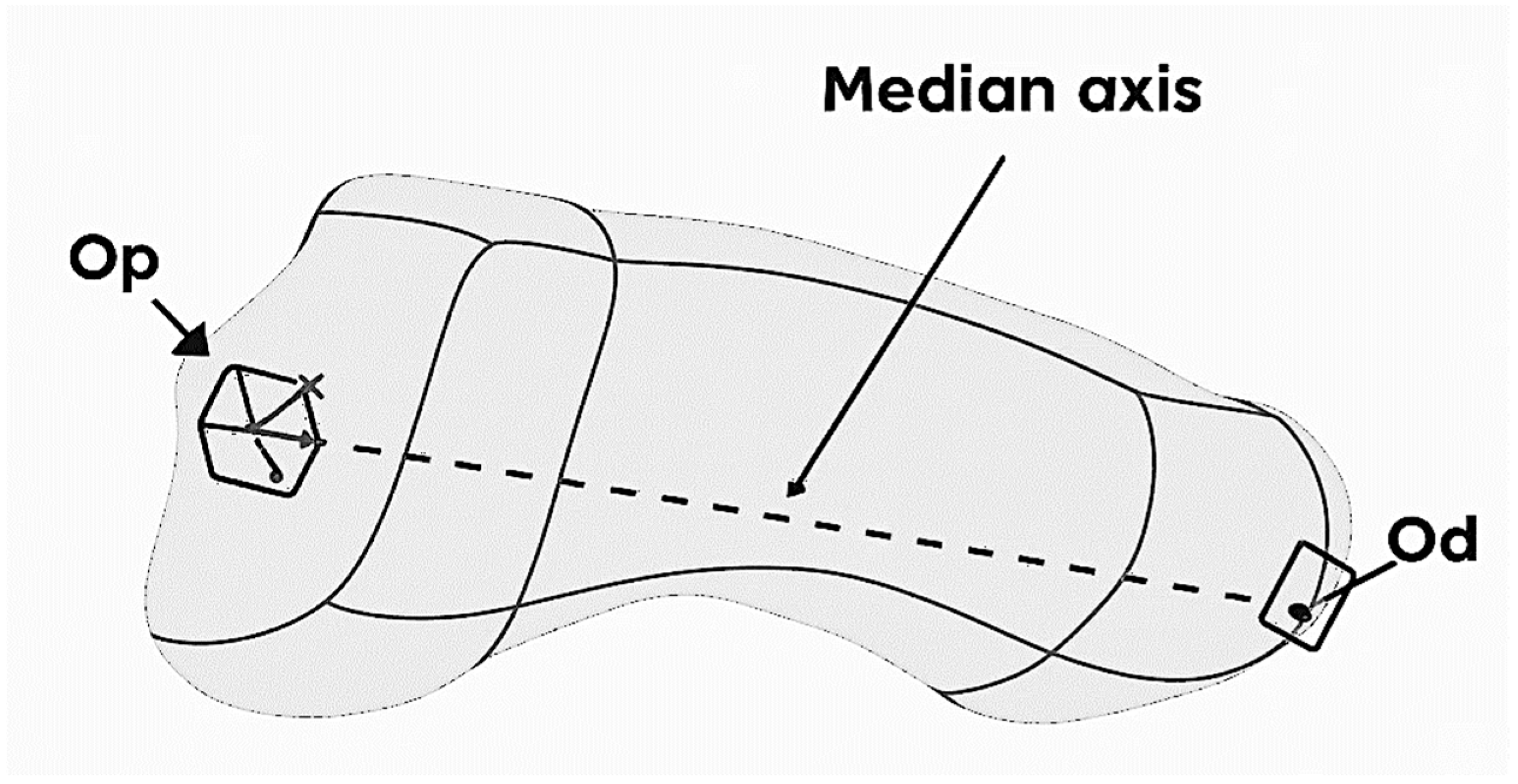 The STP format was introduced in Catia V5 where the Jones fracture at the level of the 5th metatarsal was defined. The modeling started from defining the median axis of the bone, built between two anatomical landmarks: the proximal point (Op) located in the geometric center of the cubometatarsal joint and the distal point (Od) located in the geometric center of the metatarsophalangeal joint, that can be observed in