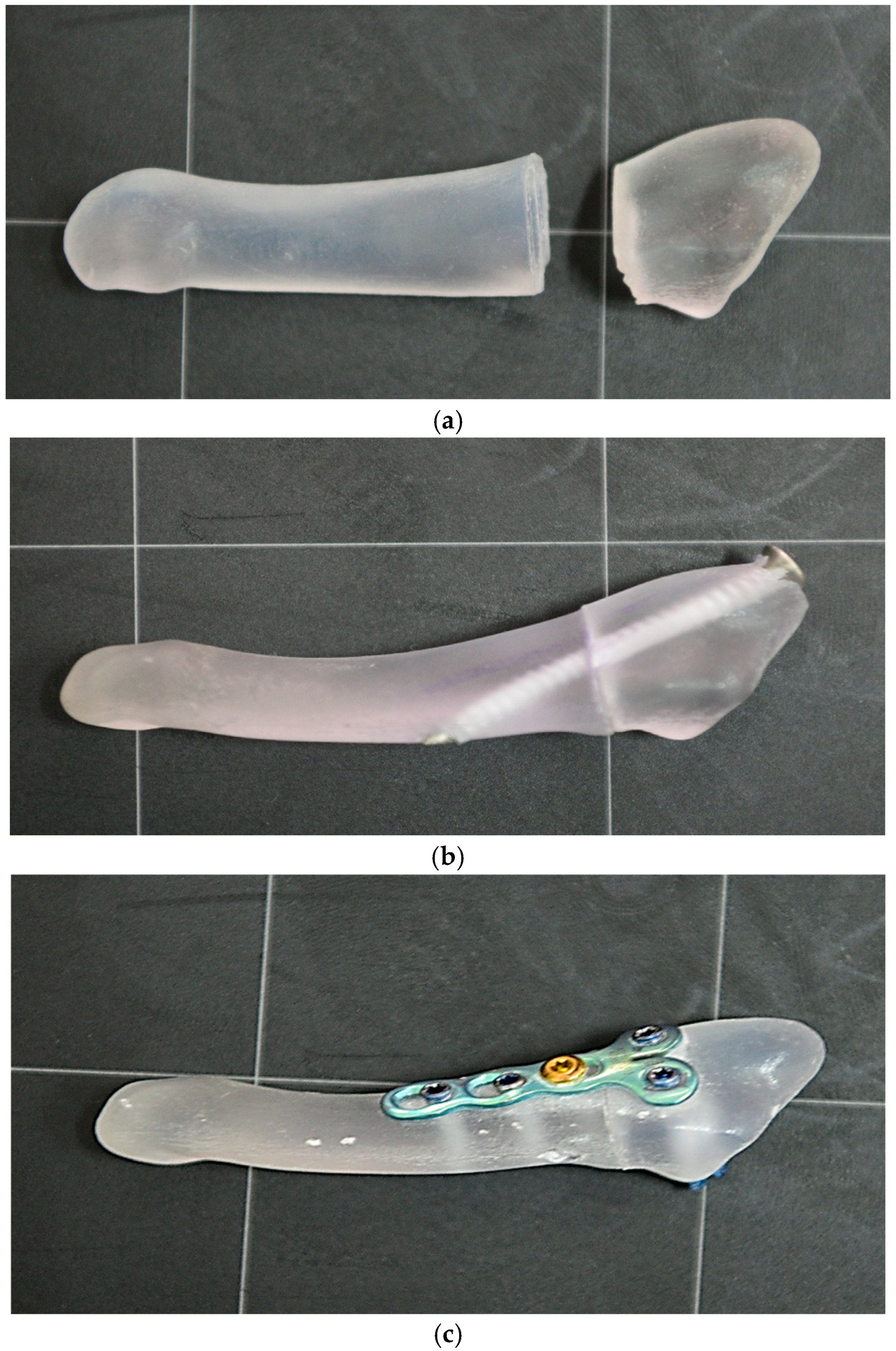18]. The models were fabricated from a mixture of rigid and flexible materials, calibrated to approximate cortical and cancellous bone. The values obtained (elastic modulus 1.3–1.6 GPa, compressive strength 65–75 MPa, tensile strength 45–55 MPa) are within the characteristic ratios of human bone tissue, although higher than the ranges reported for metatarsal cortex (elastic modulus 0.38 GPa; compressive strength 40 MPa; tensile strength 50–70 MPa) [