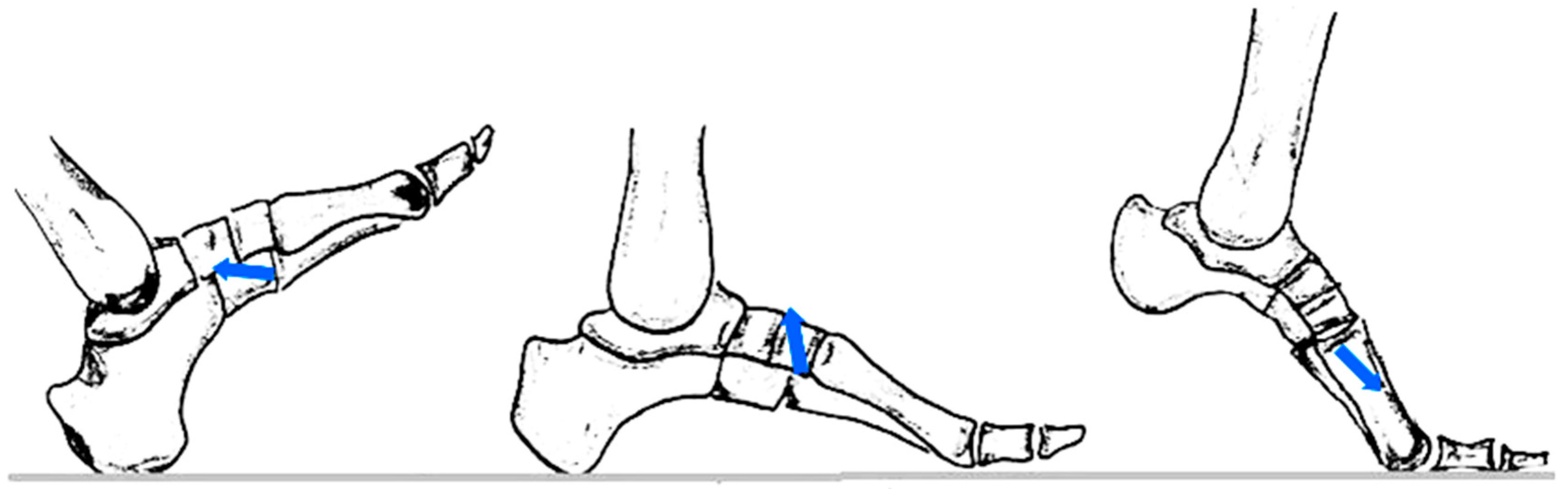 25]. Thus, during the heel strike phase, the fifth metatarsal is subjected to the supero-lateral traction of the peroneus brevis tendon (30–40 N) and the infero-medial traction of the plantar fascia (50–70 N). In the intermediate phase, the forces increase significantly, reaching an average axial load of 1.1 N, a lateral traction of approximately 70 N exercised by fascia, and a supero-lateral traction of 400 N exerted by the peroneus brevis.