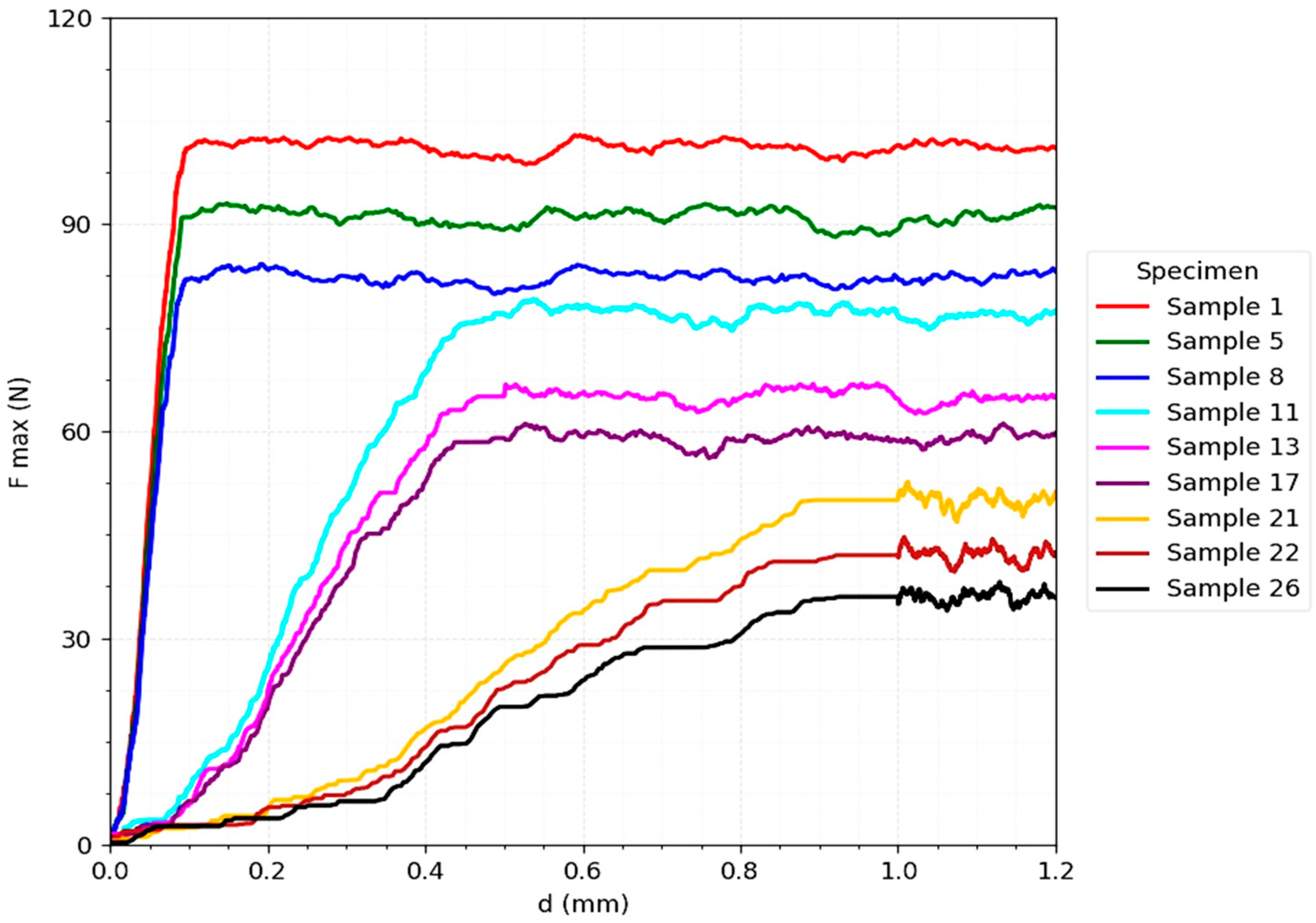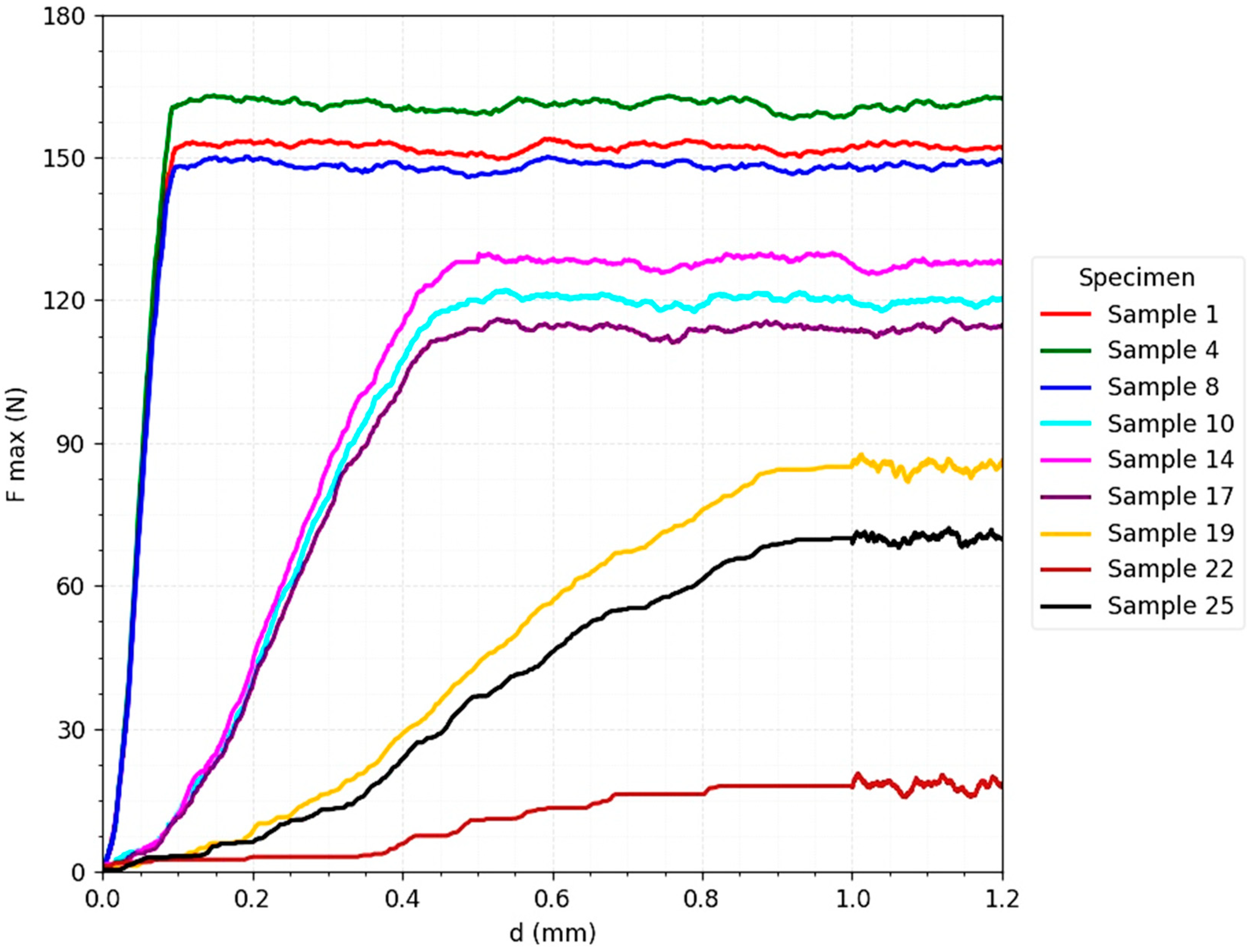The ductility index (DI) was calculated as the ratio of the area under the force–displacement curve (AUC) to the maximum force value (Fmax):