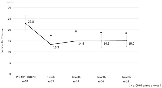 Changes in mean IOP before and after MP-TSCPC using the VITRA 810. Error bars represent standard deviation. Asterisks indicate statistically significant reductions compared with baseline (paired t-test, p < 0.05).