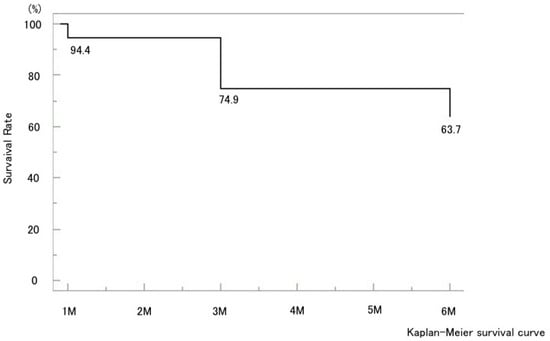 Kaplan–Meier survival curves for surgical success after MP-TSCPC using the VITRA 810. Overall cumulative probability of success, with rates of 94.4% at 1 month, 74.9% at 3 months, and 63.7% at 6 months.