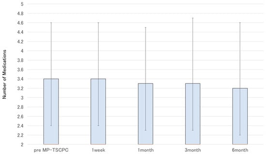 Changes in the mean number of glaucoma medications before and after MP-TSCPC using the VITRA 810. The mean number of medications was 3.4 preoperatively, 3.4 at 1 week, 3.3 at 1 month, 3.3 at 3 months, and 3.2 at 6 months. The slight reduction observed over time did not reach statistical significance.
