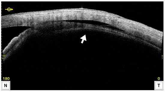 Representative AS-OCT image showing ciliochoroidal effusion (CE) after MP-TSCPC using the VITRA 810. The hyporeflective area between the ciliary body and sclera (arrow) indicates the presence of CE.