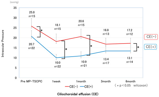 Comparison of IOP changes between CE(+) and CE(−) eyes after MP-TSCPC with the VITRA 810. The CE(+) group showed a significantly greater reduction at 1 week, 1 month, and 6 months (p < 0.05). Error bars indicate standard deviation, and asterisks denote significant differences (Wilcoxon test, p < 0.05).