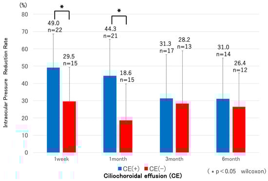 Comparison of IOP reduction rates between eyes with and without CE. The CE(+) group showed significantly greater reductions at 1 week and 1 month (p < 0.05), while no differences were observed at 3 and 6 months. Asterisks indicate significant differences (Wilcoxon test, p < 0.05).