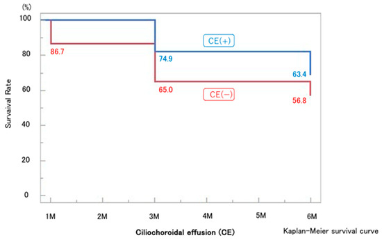CE was detected by AS-OCT (Figure 4) in 22 eyes (59.4%) at 1 week and had resolved in all cases by 1 month postoperatively, except for one eye that developed phthisis bulbi; thereafter, IOP in the CE-positive group tended to increase. In most CE(+) cases, CE was observed in one or two quadrants at 1 week postoperatively; however, in the case that developed phthisis bulbi, marked CE was present in all four quadrants even at 3 months after MP-TSCPC. Both groups showed significant IOP reductions from baseline at all postoperative time points (p < 0.05). In the CE(+) group, IOP decreased from 20.7 ± 5.8 mmHg preoperatively to 10.0–13.4 mmHg during follow-up (31–49% reduction). In the CE(−) group, IOP decreased from 25.8 ± 7.8 mmHg to 16.8–20.6 mmHg (18–29% reduction). Between-group comparisons showed significantly lower IOP in the CE(+) group at baseline and at 1 week, 1 month, and 6 months (Figure 5), while the reduction rates were significantly greater in the CE(+) group at 1 week and 1 month (p < 0.05; Figure 6). The overall 6-month survival rate was 63.7% (Figure 2); rates were 63.4% in CE(+) and 56.8% in CE(−), with no significant difference (p = 0.32; Figure 7).