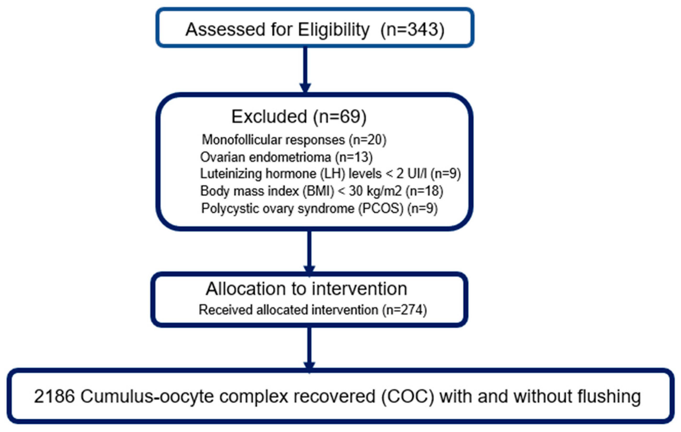 n = 9). Thus, 274 patients were included in the final analysis and received the assigned intervention according to the protocol. All retrievals resulted in the recovery of a total of 2186 cumulo-oocyte complexes (COCs), all modalities combined (with or without follicular flushing) (