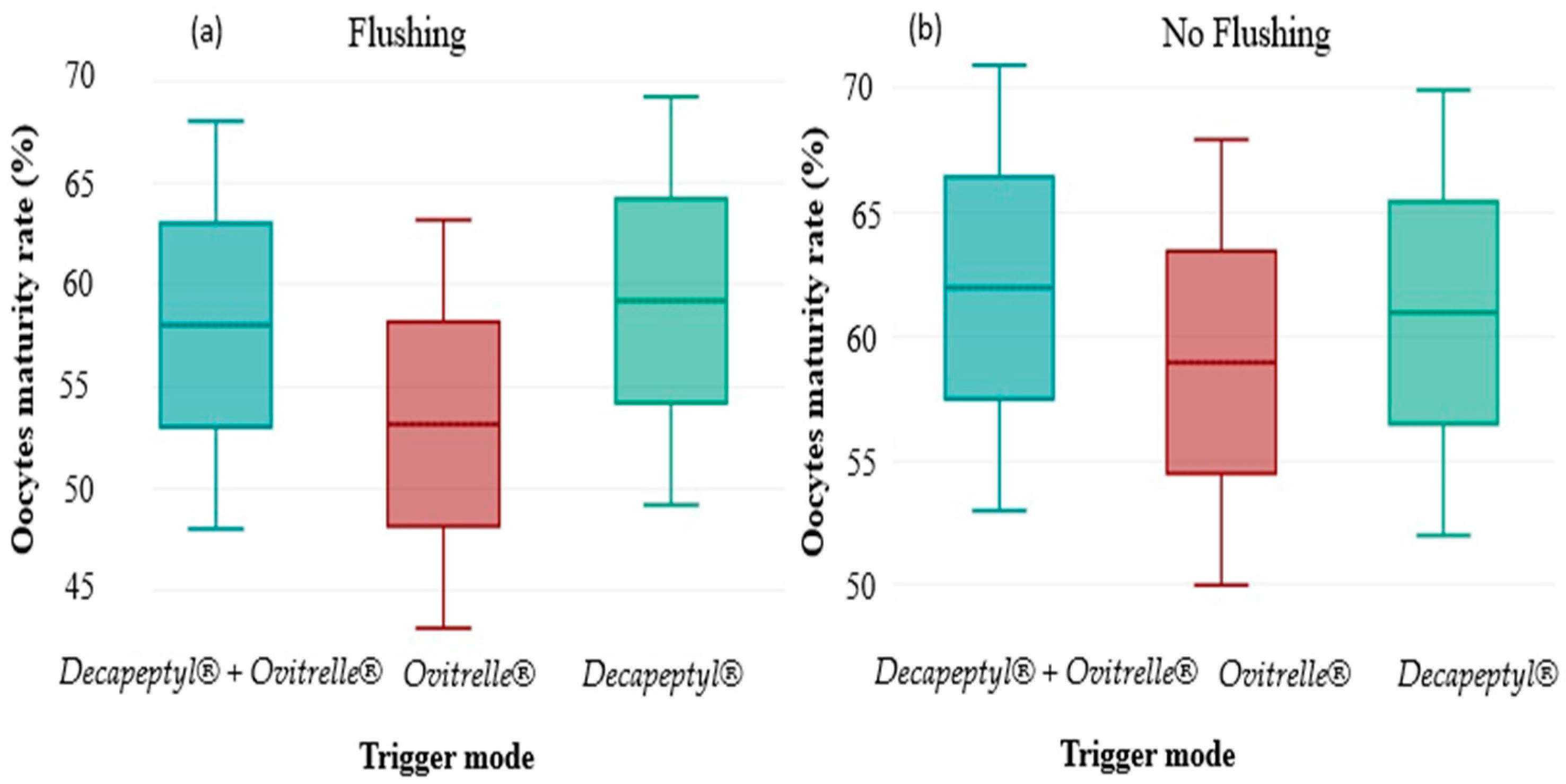 Cross-assessment of oocyte maturation rate according to the trigger protocols and the performance or not of follicular flushing revealed a significant interaction. Overall, maturation rates were higher in the groups without flushing, regardless of the protocol. A significant variation (p < 0.05) was observed in the group triggered by Ovitrelle alone, where the oocyte maturation rate increased from 60% (278/463) without flushing to 53% (176/330) with flushing. In contrast, the differences observed for the groups receiving a double trigger (Decapeptyl + Ovitrelle) or Decapeptyl alone were not statistically significant, with respective maturation rates of 63% vs. 58% (p > 0.05) and 62% vs. 59% (p > 0.05). These results suggest that follicular flushing could negatively influence oocyte maturation in certain contexts, particularly in cases of triggering by Ovitrelle alone, highlighting the need to adapt aspiration strategies according to the protocol used.