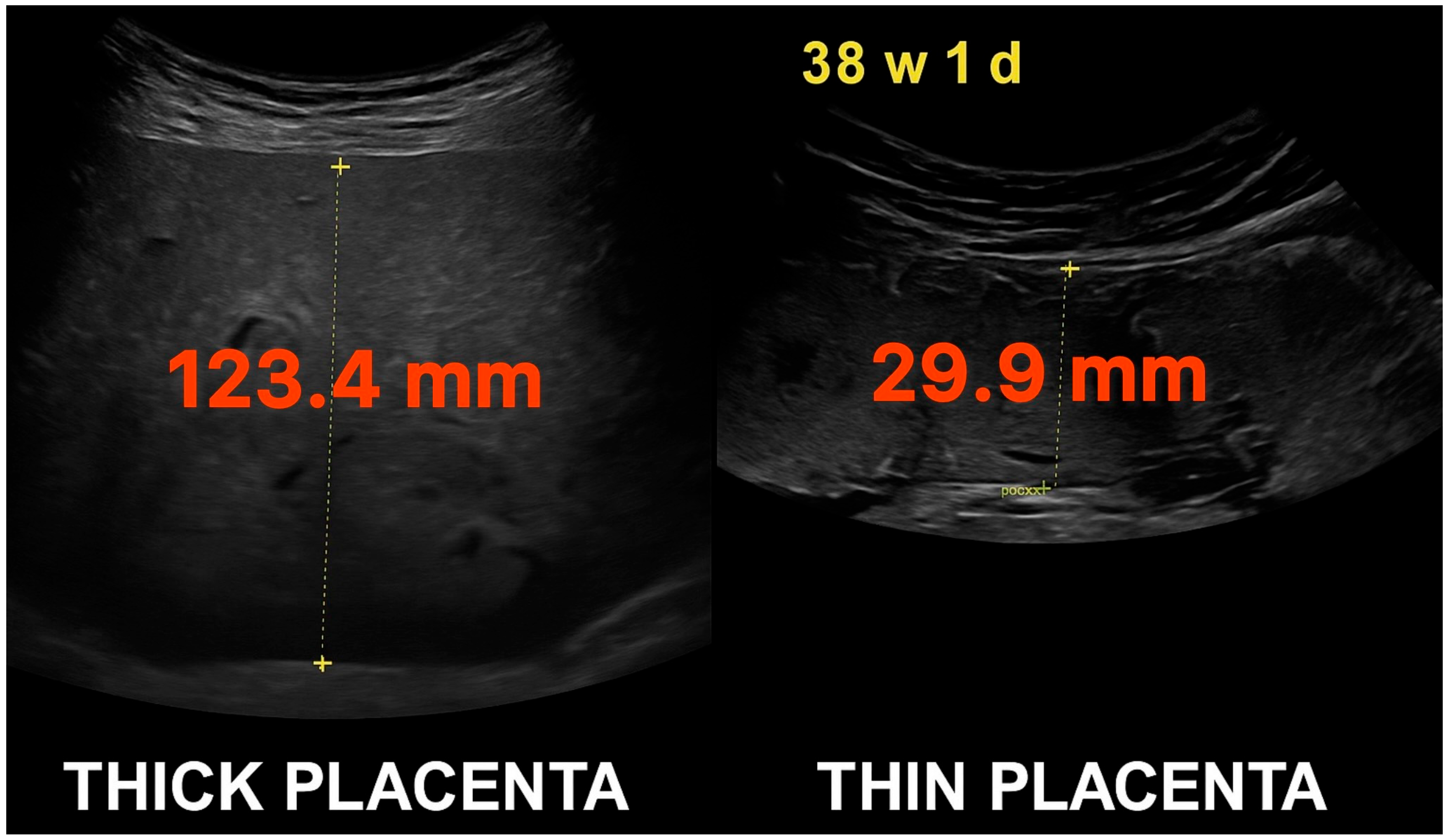 - Strzelecka, I.; Karuga, F.F.; Szmyd, B.; Walter, A.; Daszkiewicz, G.; Respondek-Liberska, M. Placental thickness in 2D prenatal ultrasonographic examination. Arch. Med. Sci. 2021, 19, 1768–1773. [Google Scholar] [CrossRef] [PubMed] [PubMed Central]