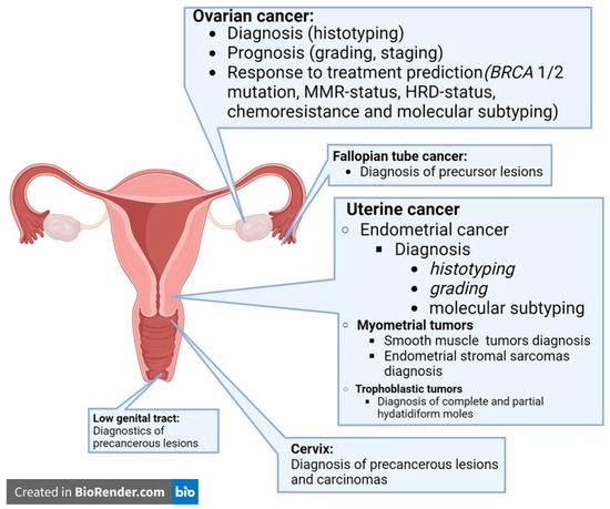 In gynecologic pathology, the applications of AI tools have already been tested for their diagnostic, prognostic, and predictive functions, tailored to the location, molecular subtyping, and target therapy of each cancer. The most frequent AI tools for the characterization of gynecologic cancers are summarized in Figure 1.