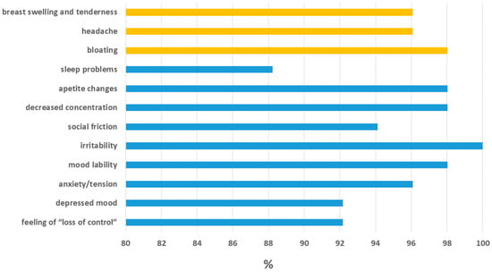 Prevalence of PMS symptoms among female students (n = 72). Physical symptoms (yellow bars), emotional/behavioral symptoms (blue bars).