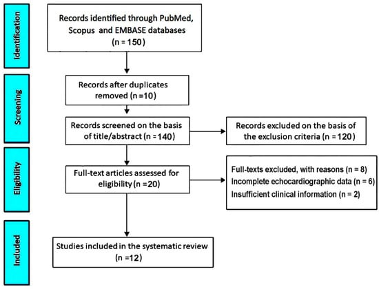 The initial database search retrieved 150 records. After removal of 10 duplicates, 140 titles and abstracts were screened. Of these, 120 records were excluded because they were clearly irrelevant, did not involve athletes, or did not evaluate MVP. Twenty full-text articles were assessed for eligibility. Among these, 8 studies were excluded: six due to incomplete or non-standardized echocardiographic data and two because of insufficient clinical information. Ultimately, 12 studies [,,,,,,,,,,,] met all inclusion criteria and were included in the present systematic review (Figure 1).