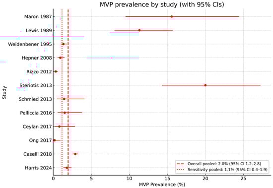 Forest plot of MVP prevalence in athletes across included studies [,,,,,,,,,,,], with overall and sensitivity pooled estimates (random-effects model). MVP, mitral valve prolapse.