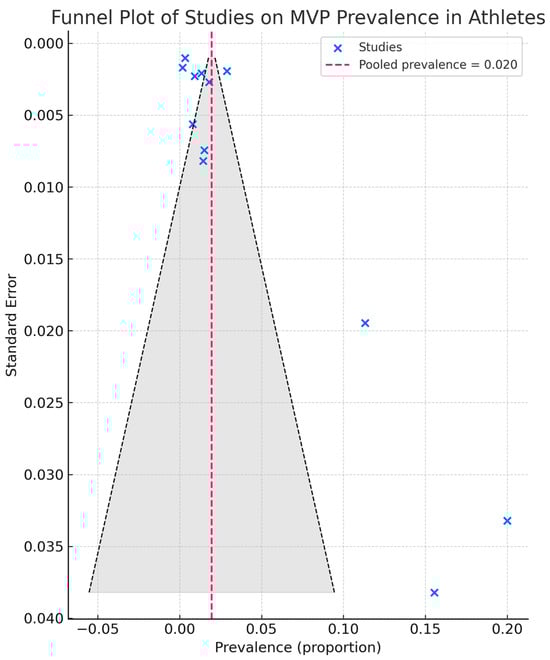Prevalence estimates from each study were calculated as the number of MVP cases divided by the total sample size. Exact binomial 95% confidence intervals were computed using the Wilson score method. For pooled analyses, proportions were transformed using the Freeman–Tukey double arcsine method to stabilize variance. A random-effects model (DerSimonian–Laird) was applied to account for between-study heterogeneity. Both an overall pooled prevalence and a sensitivity analysis restricted to unselected, contemporary athlete cohorts were performed. Results are displayed as a forest plot, with individual study estimates and corresponding 95% confidence intervals, alongside pooled estimates. To assess potential publication bias, funnel plot inspection and Egger’s regression asymmetry test were performed. Funnel plot symmetry was visually evaluated, and statistical significance of small-study effects was determined using Egger’s test. Statistical analyses were conducted using Comprehensive Meta-Analysis version 3.0 (Biostat, Englewood, NJ, USA).