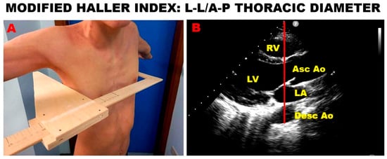 In recent years, our research group developed the modified Haller index (MHI), a novel, noninvasive anthropometric measure of chest shape conformation []. The MHI is calculated by dividing the latero-lateral external thoracic diameter—measured with a rigid ruler and level at the lower third of the sternum—by the antero-posterior (A-P) internal thoracic diameter, obtained from the echocardiographic parasternal long-axis view as the distance between the true apex of the sector and the posterior wall of the descending aorta located just behind the left atrium.