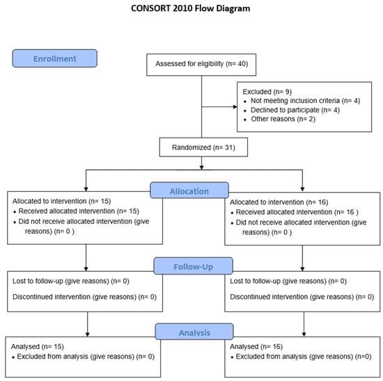 The following exclusion criteria were proposed: did not have training accredited by the AHA or ERC in CPR; a resting heart rate (HR) > 120 bpm or <35 bpm, a systolic blood pressure > 160 mmHg or <80 mmHg, diastolic > 95 mmHg; blood glucose < 65 mg/dL; severe visual/hearing impairments or functional disorders; oxygen saturation < 92%; electrocardiogram with abnormalities (arrhythmia or ST changes); a body temperature > 38 °C; diagnosis of epilepsy, infection, or ongoing treatment; and a BMI > 40 kg/m2 or acute skin or immune system diseases. The CONSORT 2010 flow diagram summarizes participant eligibility, allocation, follow-up, and analysis, and is presented below (Figure 1).