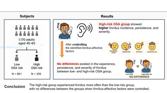APA StyleLee, S. J., Park, S. I., Choi, I. S., Lee, H. J., & Lee, J. M. (2025). Exploring a Possible Link Between Tinnitus and the Risk of Obstructive Sleep Apnea—A National Population-Based Cohort Study Using Propensity Score Matching Analysis. Journal of Clinical Medicine, 14(21), 7492. https://doi.org/10.3390/jcm14217492