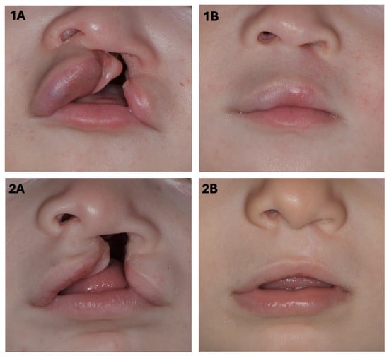Images pre- (1A,2A) and post- (1B,2B) surgery of two patients with complete unilateral cleft lip, jaw, and palate, who underwent cleft lip repair using Fisher’s anatomical subunit approximation technique.