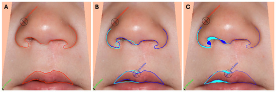 (A): Manual placing of the tracing points and contouring of the lower edge of the nose and upper lip. (B,C): SymNose analysis of the asymmetry of the nasal base, the asymmetry of the upper lip, and the asymmetry of the upper lip in relation to the midline of the face and to assess the percentage mismatch. ((B): mismatch display in lines; (C): mismatch display in areas).