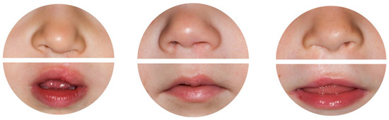 - McKearney, R.M.; Williams, J.V.; Mercer, N.S. Quantitative computer-based assessment of lip symmetry following cleft lip repair. Cleft Palate-Craniofacial J. 2013, 50, 138–143. [Google Scholar] [CrossRef]