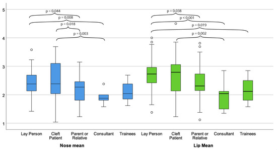 The graphic illustrates the statistically significant differences between the rater subgroups in their assessment of nasal appearance, shown in blue box plots, and labial aesthetics, depicted in green box plots (post hoc test).