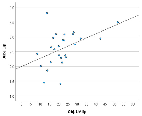 A significant positive correlation between the objective measurement of lip asymmetry (UA Lip) and subjective assessment was found (r = 0.455; p = 0.020) (Figure 5).