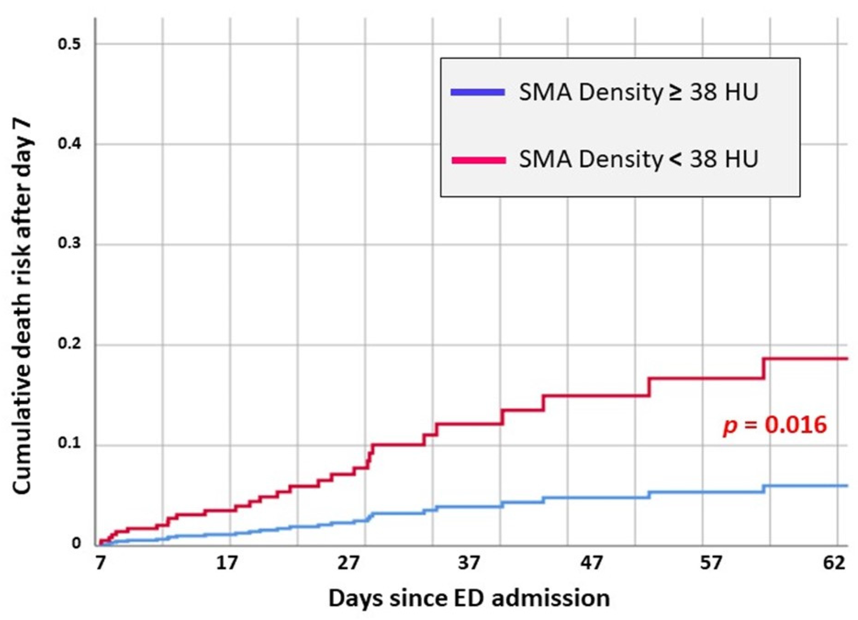 | SMA Density < 38 HU | 1.137 | 5.771 | 3.12 [1.23–7.88] | 0.016 |