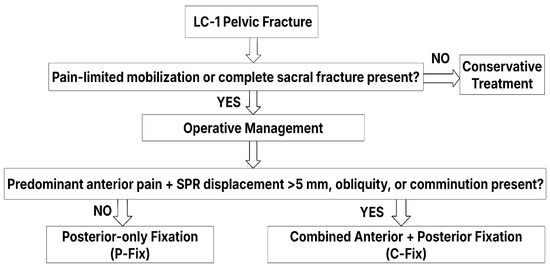 Non-operative treatment continues to represent the mainstay of management for LC-1 fractures [19,21]. Patients with incomplete sacral fractures, reported in approximately 50–68% of LC-1 injuries, are generally considered suitable for trial mobilization [34]. Those demonstrating sufficient clinical stability are regarded as candidates for conservative treatment [16]. In our screened population, a substantial proportion of patients were managed non-operatively according to this principle. However, our analytic cohort included only patients for whom percutaneous surgical stabilization was both indicated and feasible.