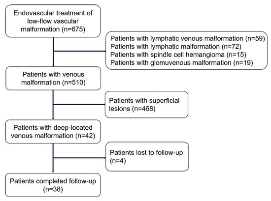 Flowchart of the inclusion and exclusion criteria of the patients. Exclusion criteria include other types of low-flow vascular malformations, superficial lesions. n = number of patients.