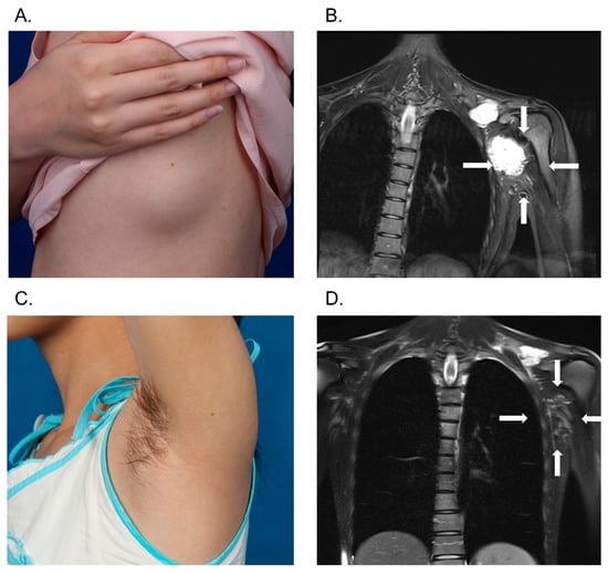 Illustration of a focal VM case. A 21-year-old female suffered from pain and swelling, cased by focal VMs in the left supraclavicular and axillary regions (A). Pretreatment T2-weighted MRI revealed a hyperintense mass in the left shoulder region, anatomically demarcated by white arrows (B). The patient underwent real-time MRI-guided sclerotherapy using BPF. Subsequent two-year follow-up reported significant clinical relief (C), and MRI demonstrated volume reduction of the VM lesions (D). VM, venous malformation; MRI, magnetic resonance imaging; BPF, bleomycin-polidocanol foam.