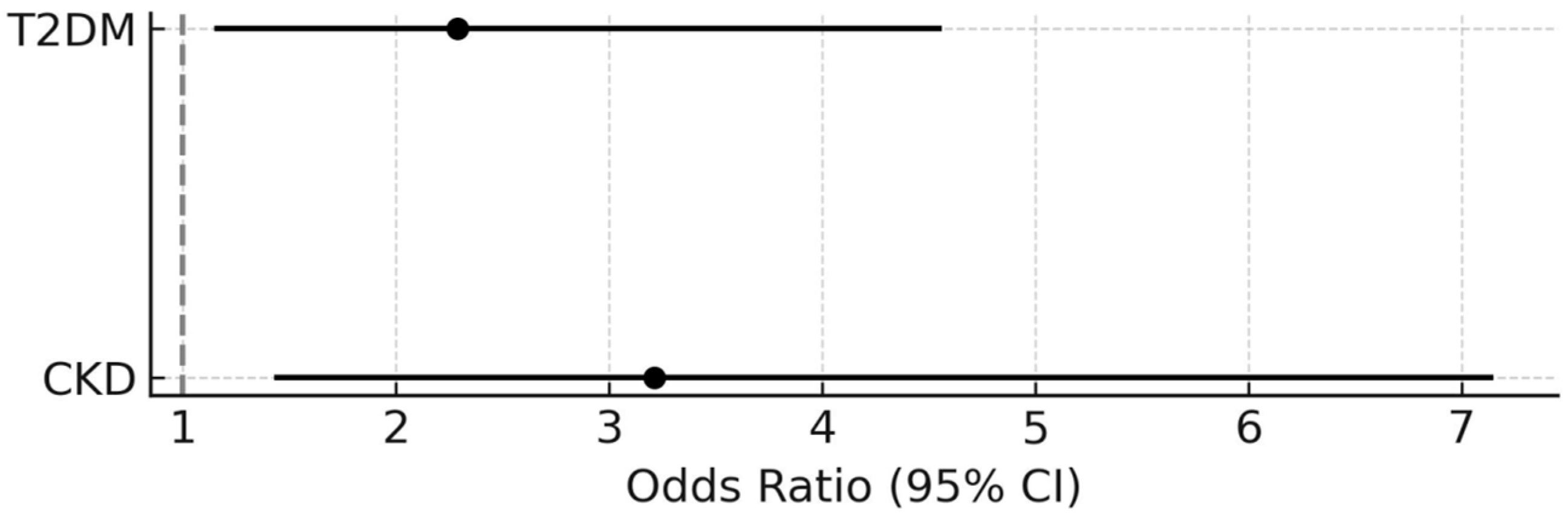 | CKD | 6.76 | 3.25–14.10 | <0.0001 | 3.59 | 1.54–8.40 | 0.003 | 5.43 | 2.61–11.31 | <0.0001 | 3.21 | 1.43–7.15 | 0.004 |