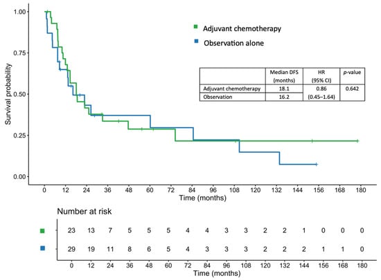 The median patient follow-up time was 27.23 (range, 1.74–178.09) months. In the adjuvant chemotherapy and observation cohorts, the median follow-up times were 32.69 (range, 1.74–178.09) and 16.23 (range, 2.37–154.67) months, respectively. The median DFS in the entire cohort was 18.1 months. Patients in the adjuvant chemotherapy group had a median DFS of 18.1 months, compared with 16.2 months among those in the observation group (hazard ratio [HR], 0.86; 95% confidence interval [CI], 0.45–1.64; p = 0.642; Figure 1).