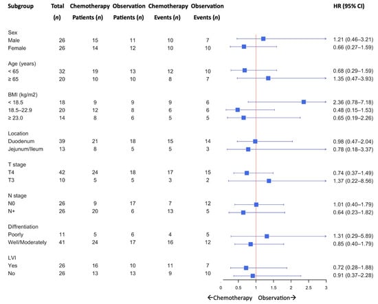 A subgroup analysis of DFS is shown in Figure 2. Although no statistically significant differences were observed across the subgroups, a trend favoring adjuvant chemotherapy was observed among patients aged < 65 years, those with non-underweight BMI, T4 tumors, and nodal involvement (N+).