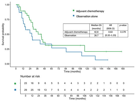 The median OS in the entire cohort was 34.1 months. The median OS was 42.8 months in the adjuvant chemotherapy group, compared with 26.7 months in the observation group (HR, 0.63; 95% CI, 0.32–1.23; p = 0.179; Figure 3). After adjustment using a multivariate Cox proportional hazards regression model, the adjusted HR was 0.61 (95% CI, 0.22–1.74; p = 0.357). The 1-, 2-, and 3-year OS rates in the adjuvant chemotherapy group were 89.3%, 74.1%, and 54.3%, respectively, compared with 77.3%, 51.8%, and 40.3%, respectively, in the observation group.