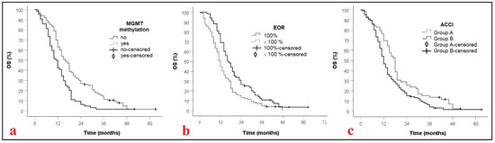Kaplan–Meier curves displaying OS of GBM patients according to MGMT methylation, p = 0.001, (a); EOR, p = 0.001 (b), and ACCI, p = 0.015, (c). MGMT: methylguanine-DNA methyltransferase; EOR: extent of resection; ACCI: Age adjusted comorbidity index; OS: Overall survival.