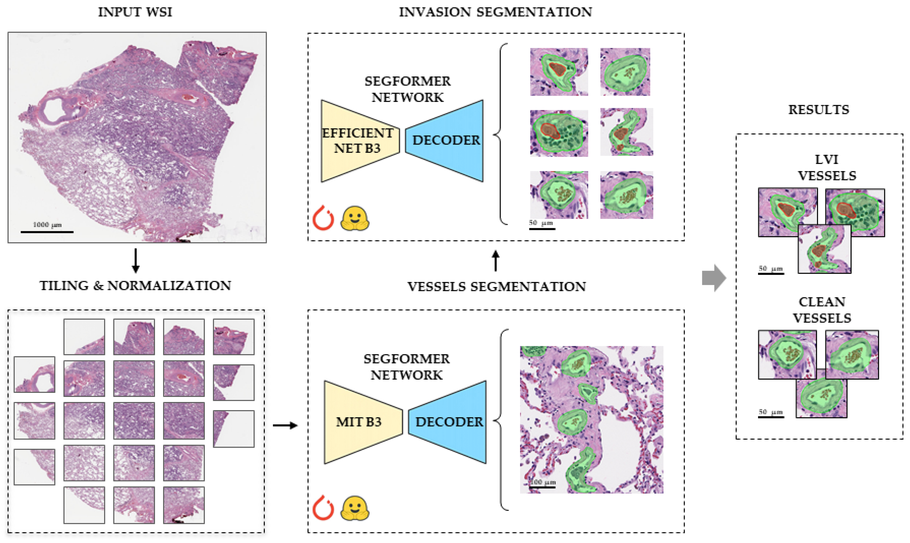 - Timakova, A.; Ananev, V.; Fayzullin, A.; Zemnuhov, E.; Rumyantsev, E.; Zharov, A.; Zharkov, N.; Zotova, V.; Shchelokova, E.; Demura, T.; et al. LVI-PathNet: Segmentation-classification pipeline for detection of lymphovascular invasion in whole slide images of lung adenocarcinoma. J. Pathol. Inform. 2024, 15, 100395. [Google Scholar] [CrossRef]