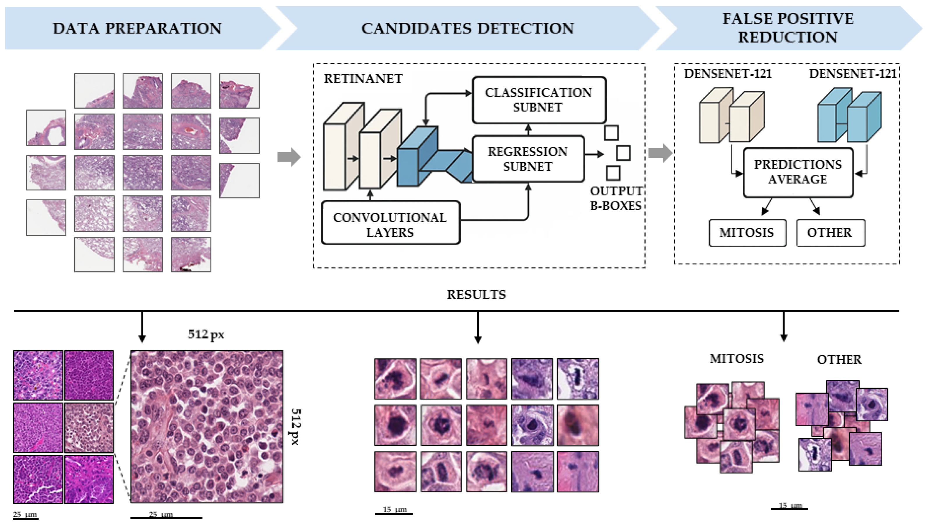 - Stathonikos, N.; Aubreville, M.; de Vries, S.; Wilm, F.; Bertram, C.A.; Veta, M.; van Diest, P.J. Breast cancer survival prediction using an automated mitosis detection pipeline. J. Pathol. Clin. Res. 2024, 10, e70008. [Google Scholar] [CrossRef]