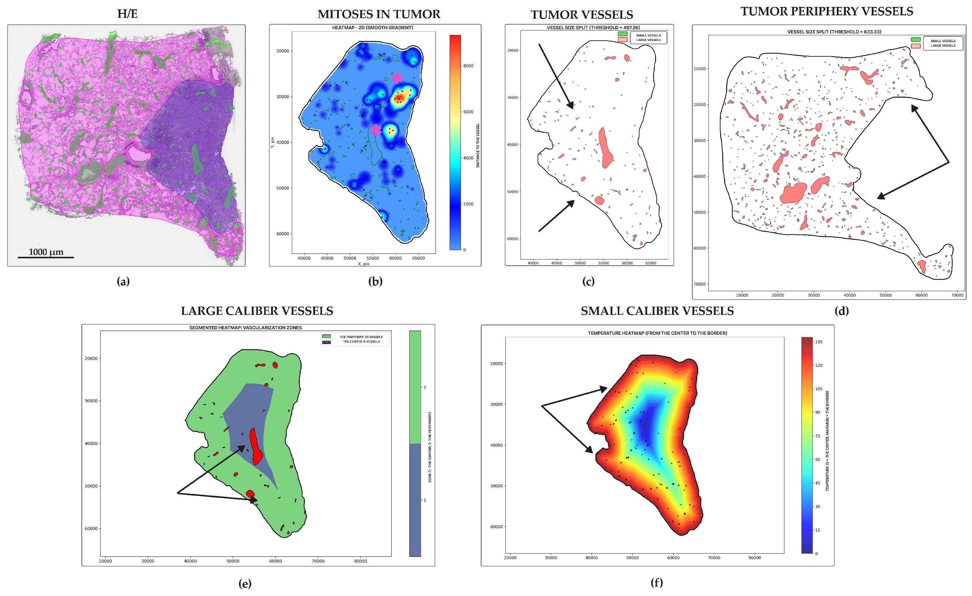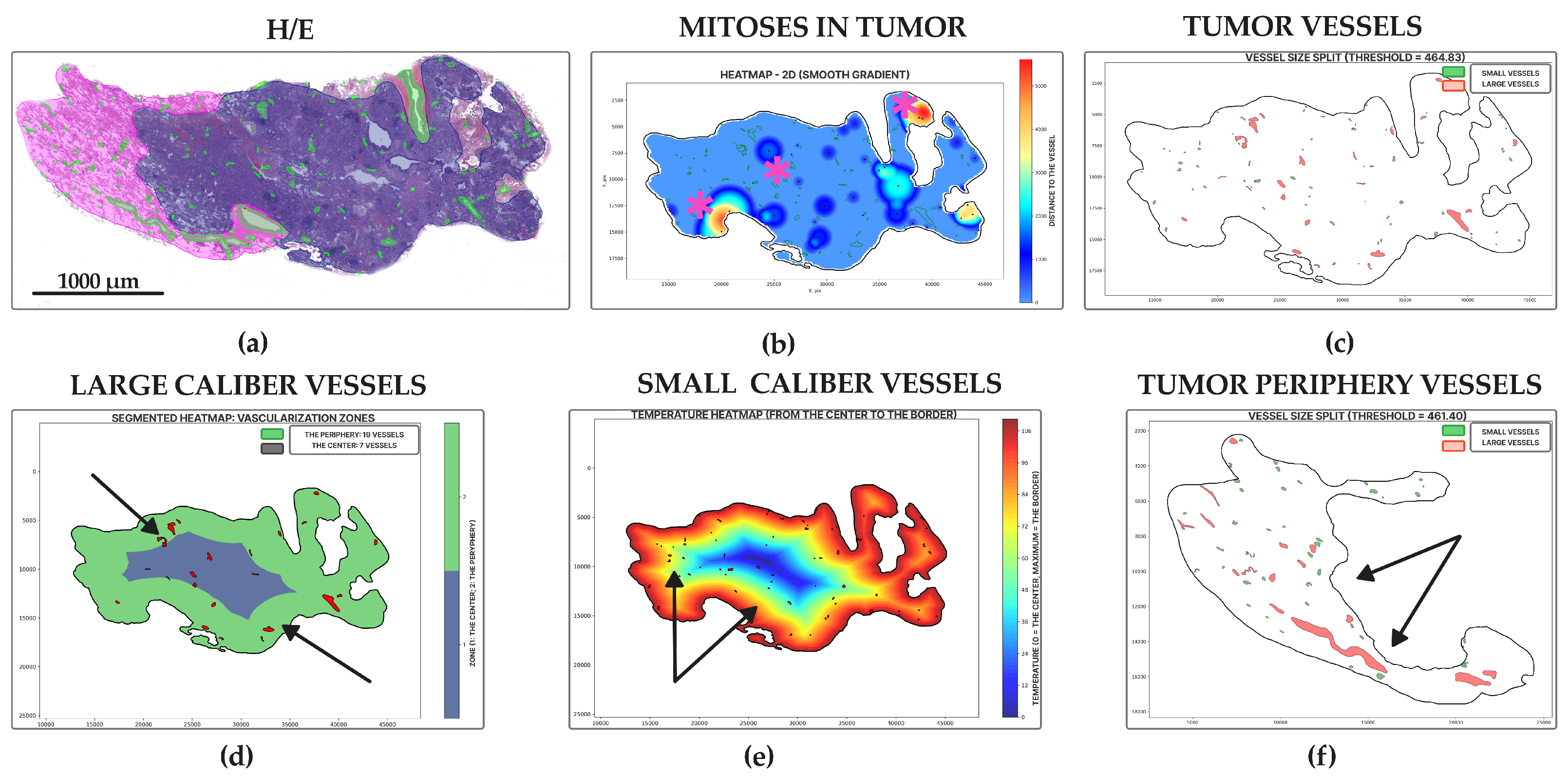 Shannon entropy (in tumor) | SE | where -K—number of spatial segments (for example, grid cells or clusters), -—the relative frequency of mitosis in the I-th segment, dits | It shows how evenly or focused the mitotic foci are. Identification of “hot spots” (clusters) of aggressive growth |