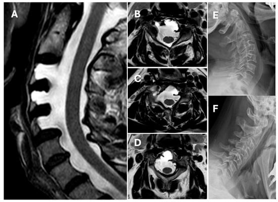Illustrative case. (A) Magnetic resonance imaging (MRI) T2-weighted sagittal scan showing C3, C4, and C5 anterior cervical meningocele. (B) MRI T2-weighted axial scan showing C3 anterior meningocele. (C) MRI T2-weighted axial scan showing C4 anterior meningocele. (D) MRI T2-weighted axial scan showing C5 anterior meningocele. (E) Dynamic lateral X-ray scan of the neck in maximum extension and (F) in maximum flexion does not show signs of cervical instability.