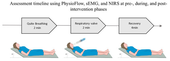 Next, the PhysioFlow® (Manatec Inc., Paris, France). electrodes will be placed, and the NIRS device will be attached to the participant, who will then be taken to bed to begin the pre-intervention stage (PRE-IN). In a semi-recumbent position with the trunk elevated at 45°, hemodynamics will be evaluated by electrical impedance through PhysioFlow®, respiratory muscle activity will be measured by Surface Electromyography (sEMG), and tissue oxygenation will be assessed via near-infrared spectroscopy (NIRS). After this evaluation stage, which will be used for comparison with the IN and POST-IN stages of the other interventions.