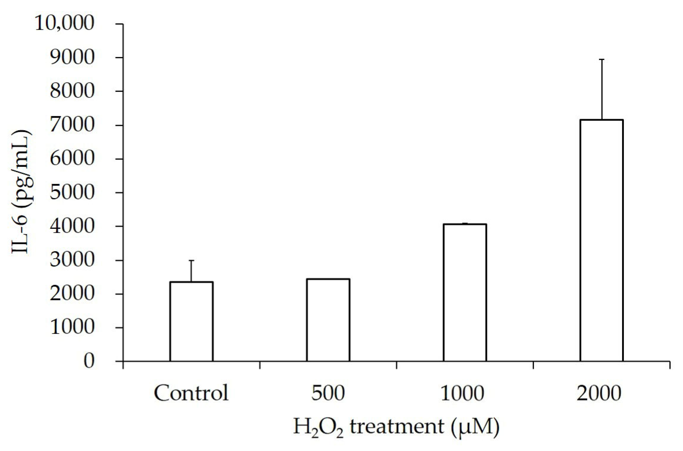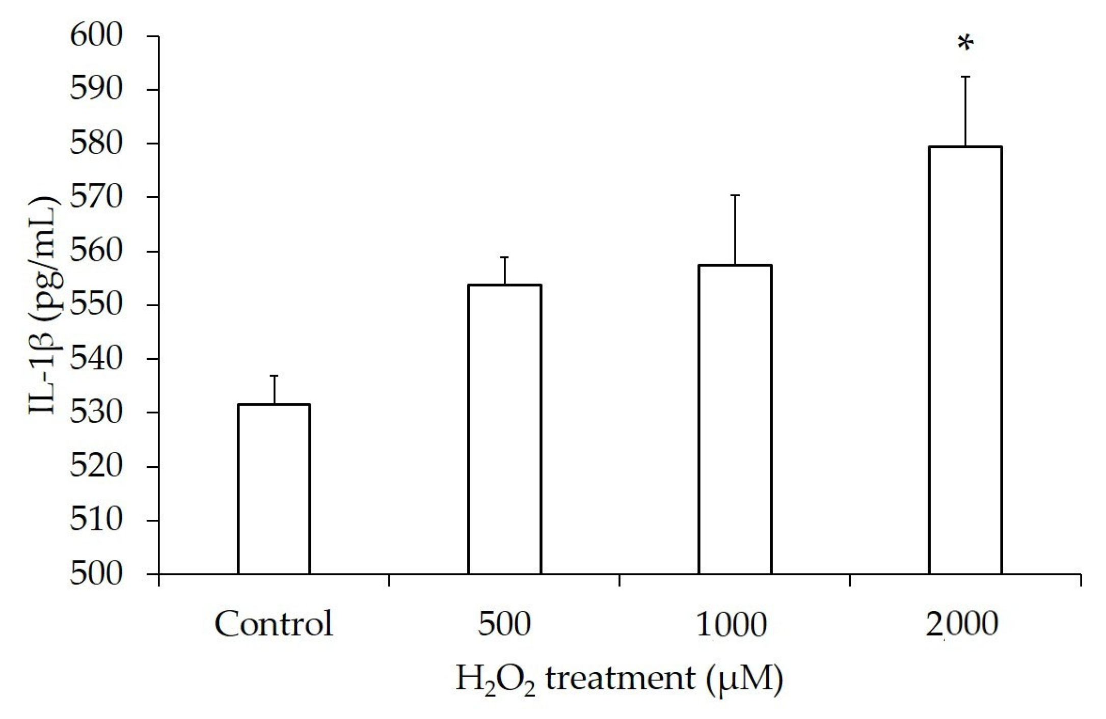 | H2O2 Concentration | IL-1β (pg/mL) | p-Value | IL-6 (pg/mL) | p-Value |