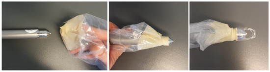 CAP was applied intraoperatively to the inguinal wound edges, after suturing the subcutaneous tissue, directly before cutaneous closure (staples/sutures). For this purpose, the handpiece of the kINPen® was wrapped sterilely using a paediatric laparoscopic transducer cover (Laparoscopic Transducer cover (15.2 × 244 cm), sterile, REF UA0067, CIVCO, Coralville, IA, USA) as well as the sterile conical spacer (Spacer (conical), sterile, REF KPM502, neoplas med, Greifswald, Germany) (Figure 1 and Figure 2).