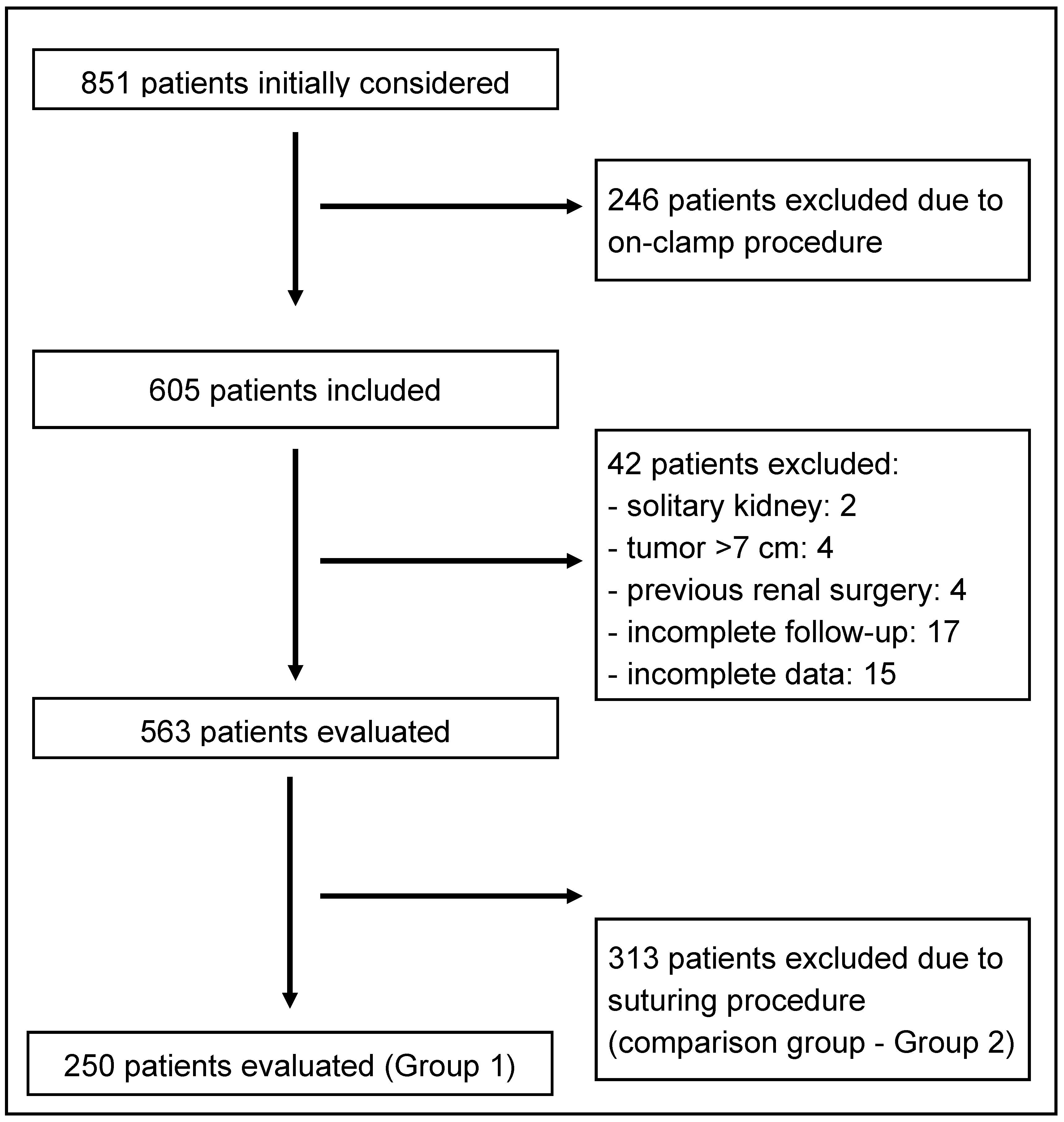 - Matching: 1:1 comparison between off-clamp RAPN (Group 1) and conventional RAPN with parenchymal suturing (Group 2), based on comparable baseline characteristics.