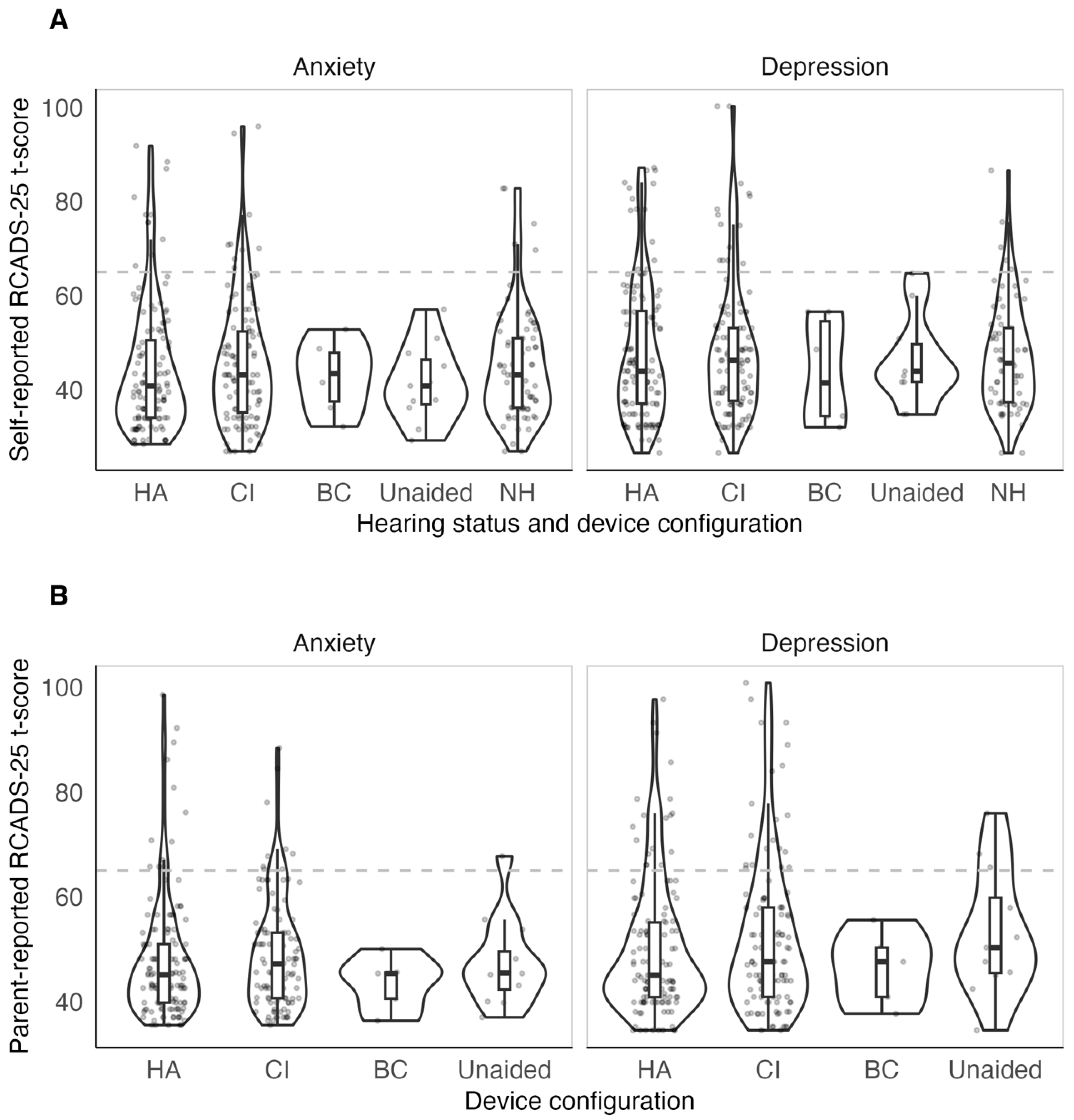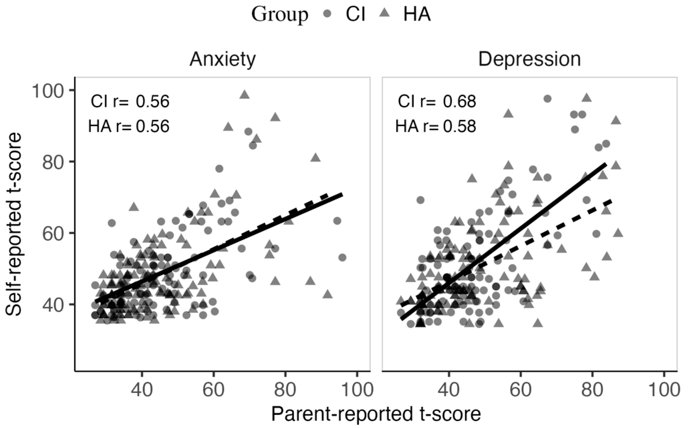 3.4. Association Between Parent and Self-Reported Anxiety and Depression Symptoms in HA and CI Users
